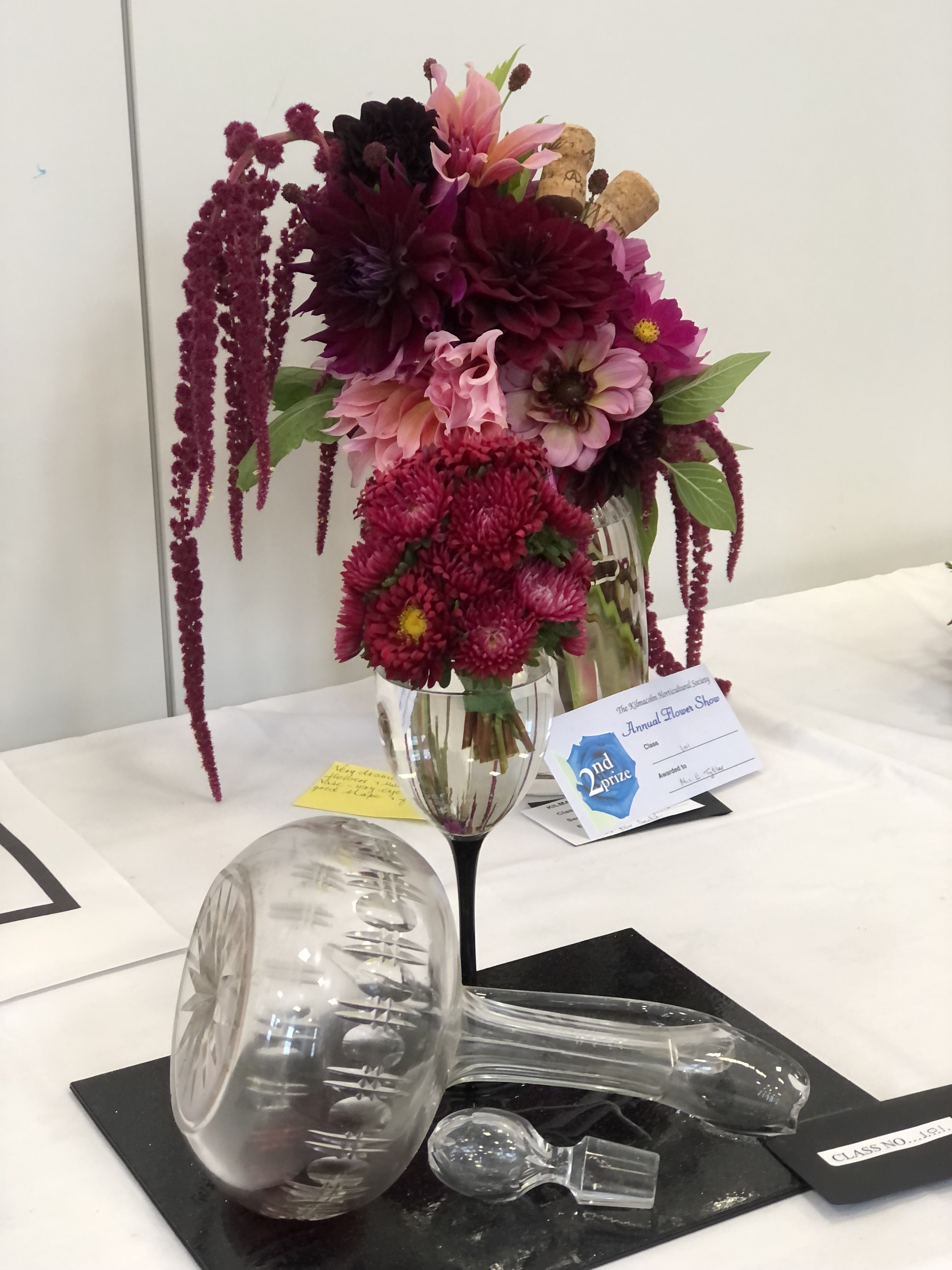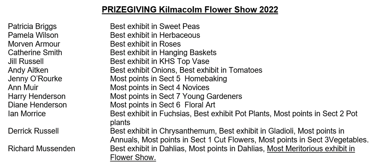 D Russell Best exhibit in Annuals, best exhibit in Gladioli, best exhibit in Chrysanthemum, best exhibit in Tomatoes, most points in section 1 Cut Flowers, most points in section 3 Vegetables, Award of the John Tainsh Memorial Quaich for the most meritorious exhibit in Kilmacolm Flower Show.