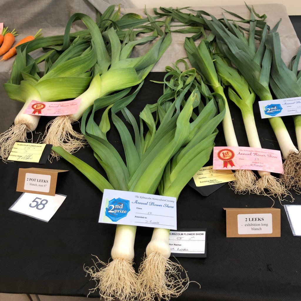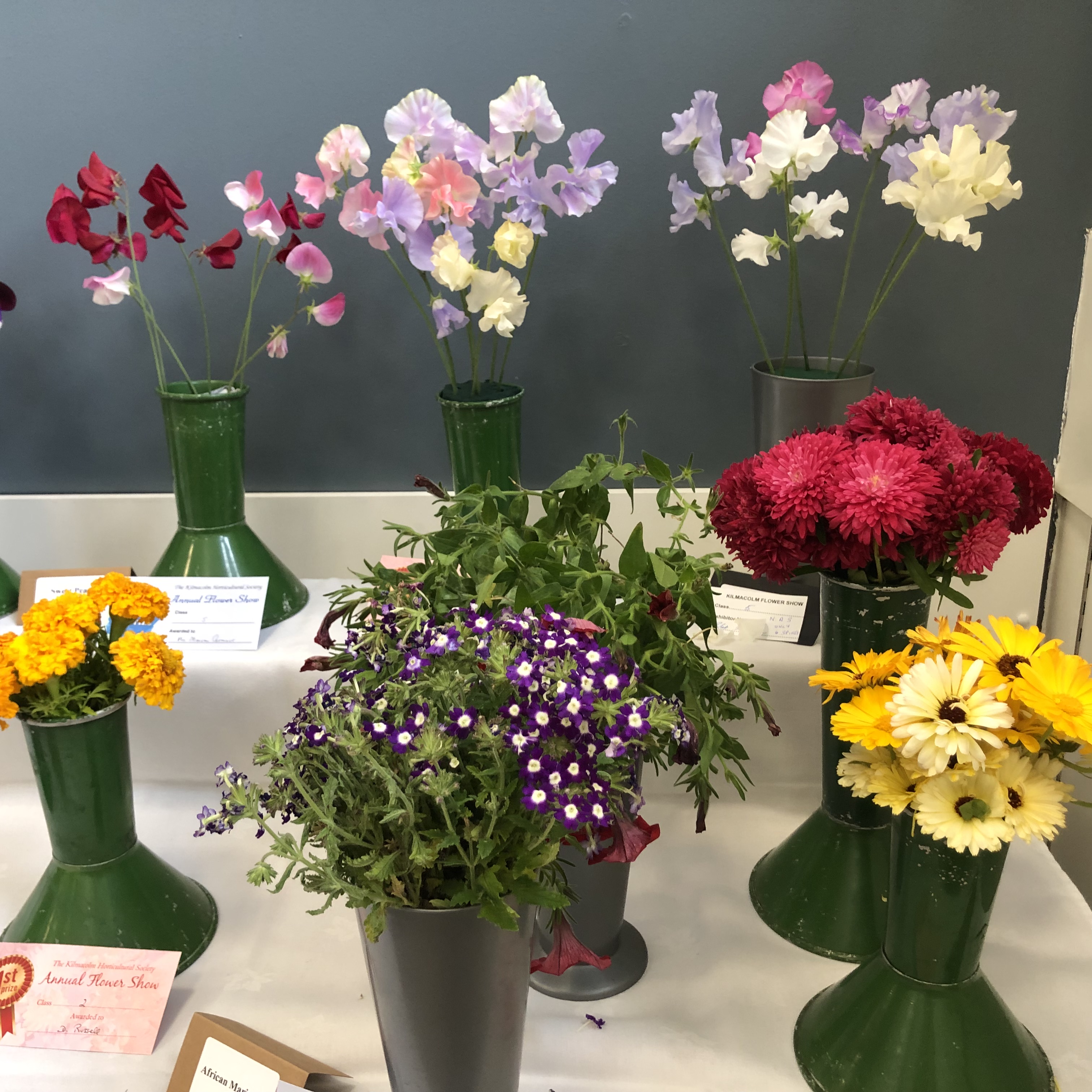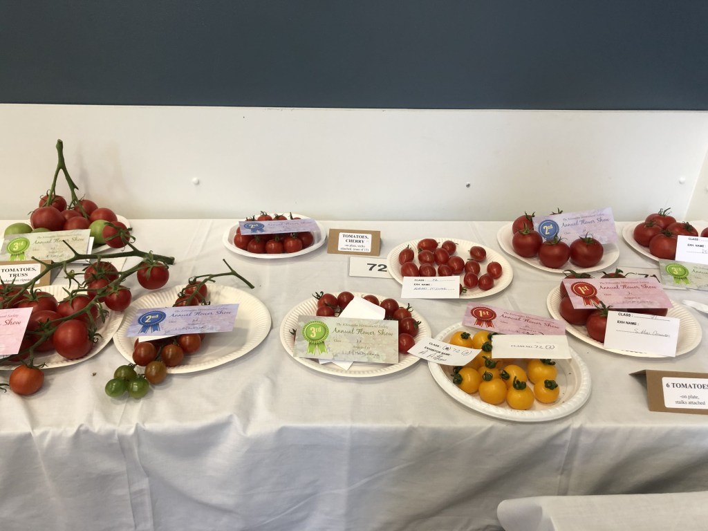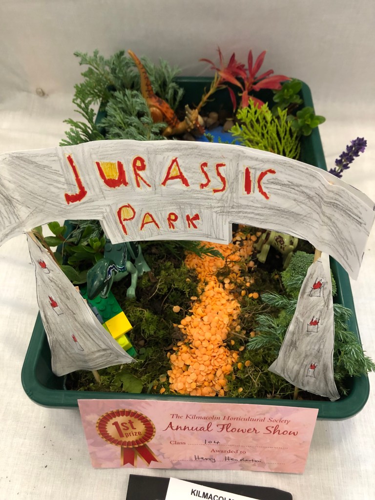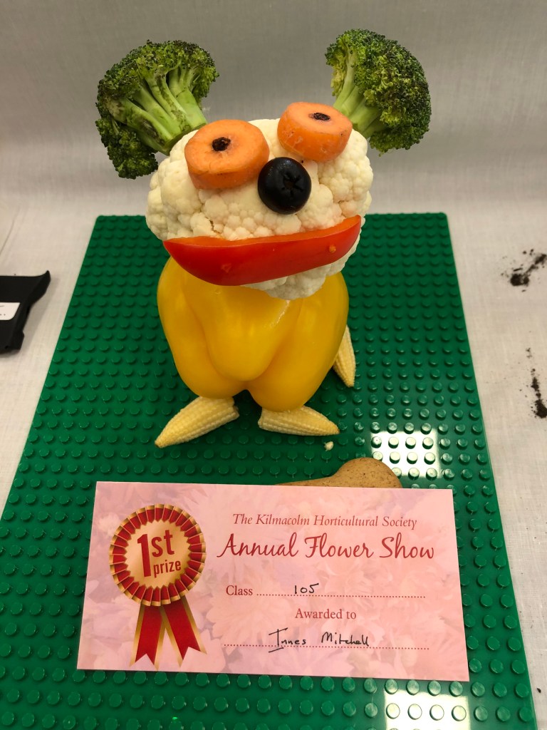 2024 The Annual Flower Show was held on Saturday 31st August, 2024, in the New Community Centre, Kilmacolm. Despite the poor weather conditions throughout the ‘summer’, gardeners nurtures their plants, protected them from cold and wind and slugs. Members made a huge effort to contribute entries, but special thanks go to the Caddlehill Allotments boys who came up trumps with their cut flowers, vegetables, pot plants, giving up their time to exhibit at our Show. The children of Kilmacolm Primary School and St Columba’s Junior School entered classes 109 (Superhero) and 110 (Science poster) which were awarded highly commended by the judges and the public. One of our newest members, Mrs Lynda McFie, ran away with the top awards in several categories after displaying some gold star exhibits in the Cut Flowers section. Congratulations to all, and thank you to all members and visitors to the Show.
